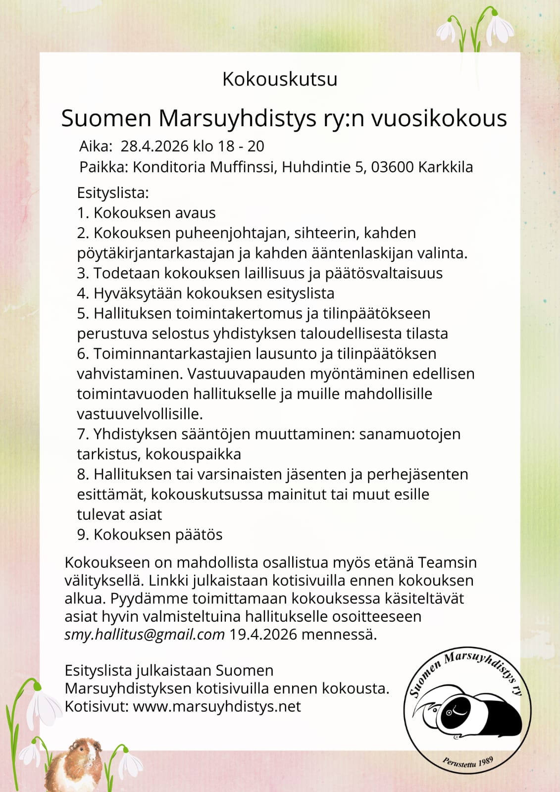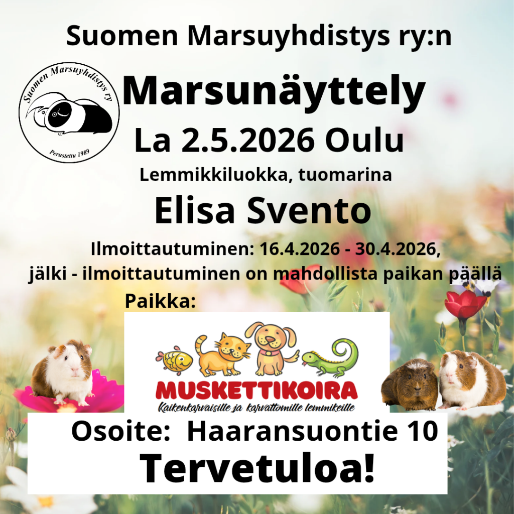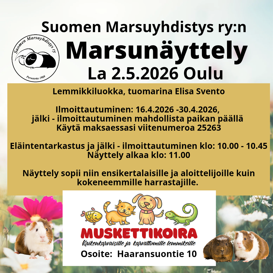 Tältä sivulta löytyvät Suomen Marsuyhdistyksen tapahtumat sekä muiden yhdistysten näyttelytiedot, mikäli niillä on SMY:n hyväksyntä. Erillisiä näyttelykutsuja ei SMY:n näyttelyihin ole. Kaikki muuttuva tieto kerrotaan tällä sivulla. Huomaathan että jokaiseen näyttelyyn, vaikka olisivat samana päivänä, on omat maksut. SMY:n näyttelyiden uml luokissa marsulla tulee olla SMY rekisteröintinumero.