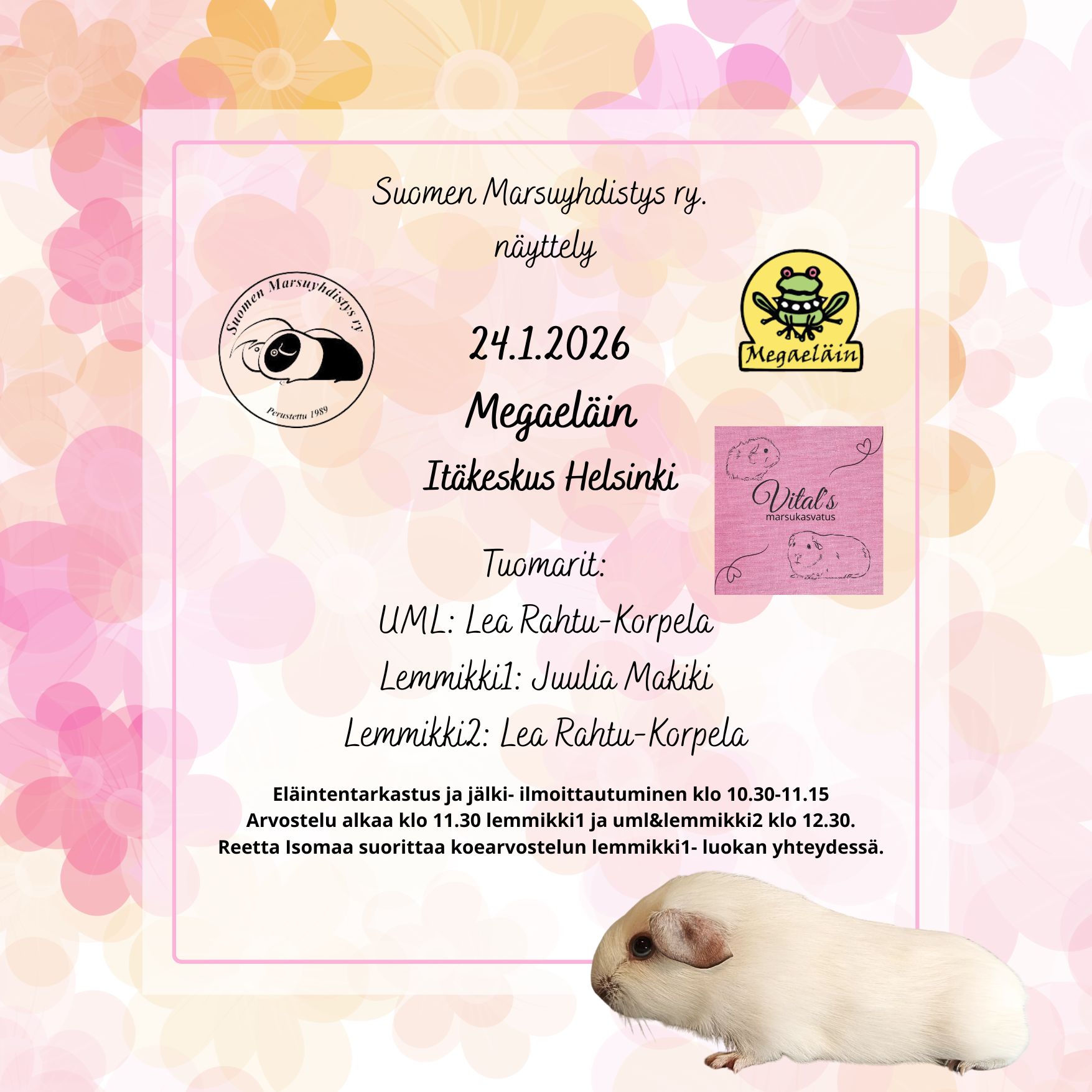 Tältä sivulta löytyvät Suomen Marsuyhdistyksen tapahtumat sekä muiden yhdistysten näyttelytiedot, mikäli niillä on SMY:n hyväksyntä. Erillisiä näyttelykutsuja ei SMY:n näyttelyihin ole. Kaikki muuttuva tieto kerrotaan tällä sivulla. Huomaathan että jokaiseen näyttelyyn, vaikka olisivat samana päivänä, on omat maksut. SMY:n näyttelyiden uml luokissa marsulla tulee olla SMY rekisteröintinumero.