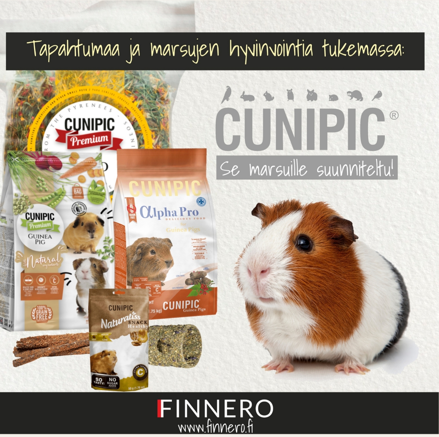 Cunipic täysravinnot ovat maistuvaa ja ravitsevaa ruokaa, joka tukee lemmikkisi terveyttä ja hyvinvointia joka päivä. Tuotemerkin takaa löytyy myös laadukkaat herkut, heinät sekä kuivikkeet. Saatavilla Suomesta FINNEROn maahantuomana.
